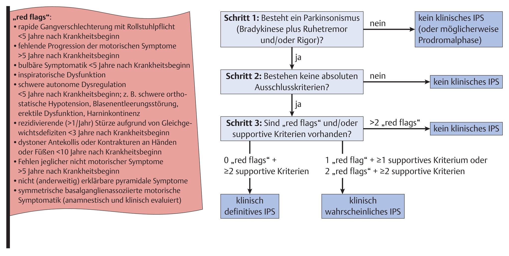 - Für das IPS wurden immer wieder verschiedene Subtypen diskutiert. Aktuell herrscht Konsens, dass es sich um ein sehr heterogenes Erkrankungsbild handelt. Definitive Subtypen, wie in der Vergangenheit vorgeschlagen, sind jedoch nicht (mehr) etabliert. Die aus Datenanalysen robusteste Subgruppe (nur 10–25% der Patienten) zeigt ein breites Spektrum nicht motorischer Symptome (z.B. „mild cognitive impairment“ [MCI], REM-Schlaf-Verhaltensstörung, Dysautonomie), frühe ausgeprägte motorische Einschränkungen und einen rascheren Verlauf.