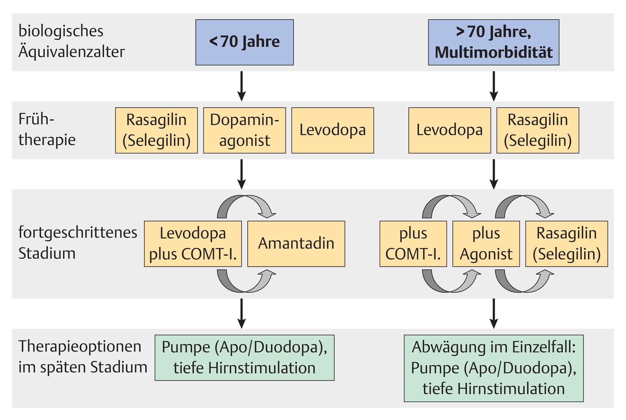 - Die meisten Patienten unter 70 Jahre beginnen die Pharmakotherapie mit einem Dopaminagonisten.